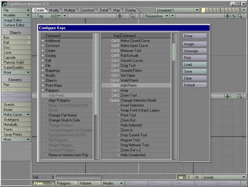 | Tip: If at any point you want to change the settings back to LightWave's default, press F1 to bring up the Config Keys menu and click that menu's "Default" button. Those settings would then be used in both the current and future sessions of Modeler. |
